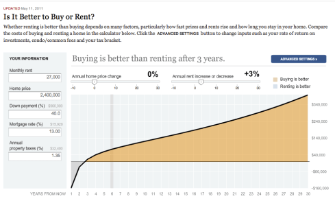 ¿Es todo malo para los dueños de casas? No. Tal vez puedas pagarla de contado, o tal vez tus costos de transacción sean muy bajos. Tal vez tienes otra casa y la segunda vas a pagarla gracias a las rentas que estas genere. Bajo estos supuestos estoy de acuerdo. Sin embargo, tú dirás “Es muy fácil hablar, compruébamelo con números”. Y con mucho gusto, porque este es un caso bien interesante. Voy a echar mano de las herramientas que encontré en internet.