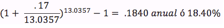 I= 27.5%, m = 365/28 que son 13.0357 periodos de 28 días en el año