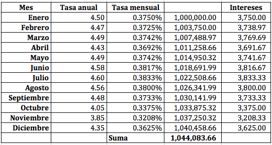 Cetes: En el caso de los Cetes, vamos a suponer que invertiste en los Cetes a 28 días y reinvertiste la utilidad (cosa que ya es posible en Cetes Directo de forma automática) desde enero hasta diciembre del 2010. El cálculo queda de esta manera:
