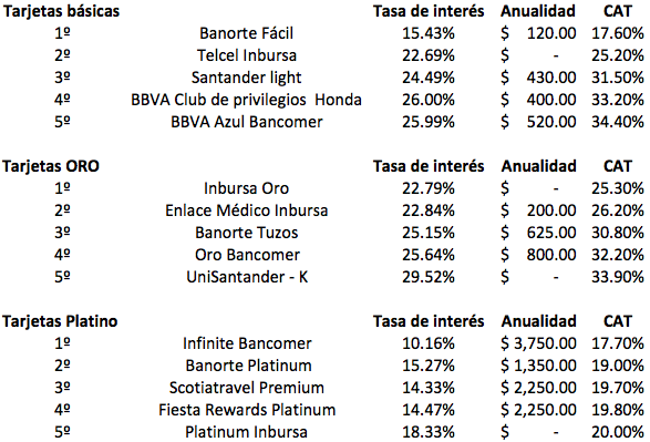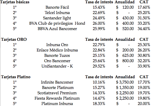 Cuando contratas un crédito, te fijas en varias cosas, pero lo más importante es cuánto te cobran. Para esto, se inventó el costo anual total o mejor conocido como CAT, con el que puedes comparar créditos. Está expresado en términos anuales e incluye el total de costos y gastos que conlleva un crédito, como anualidades, costo de apertura, y demás. La forma de calcular el CAT se encuentra en la circular número 21/2009 del Banco de México y está redactada de forma sencilla y práctica. Basándonos en este número que te dice en cuánto sale tu crédito, te presento el top 5 por categoría de las tarjetas de crédito a la fecha de hoy (los valores e intereses varían cada cierto tiempo) Sin más preámbulos, este es el top 5 de las tarjetas de crédito: