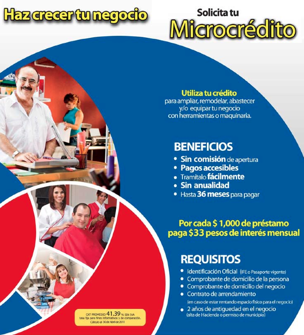 Cuidado con la publicidad y mejor básate en el CAT: costo anual total. Esta es como una regla con la cual podrás medir cualquier instrumento financiero CON LA MISMA VARA. Por ley, ya debe de incluirse en los folletos e información, en este caso, está escrito en letras pequeñísimas, en contraste con los fabulosos “33 por cada 1000”. Si buscas financiar tu negocio, busca la manera de que sea un crédito barato, existen fuentes de financiamiento de gobierno o programas que ofrecen tasas de a lo mucho 20%.