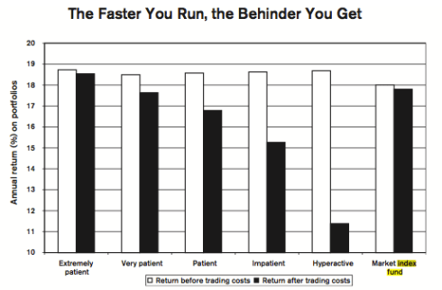 Resulta que Brad Barber y Terrance Odean, de la Universidad de California en Berkeley se han dado a la tarea de demostrar quién gana la carrera entre los traders activos y los inversionistas pacientes. (Nótese la diferencia: el inversionista obtiene un rendimiento gracias a los resultados de un negocio, no del comportamiento del mercado) ¿El resultado?