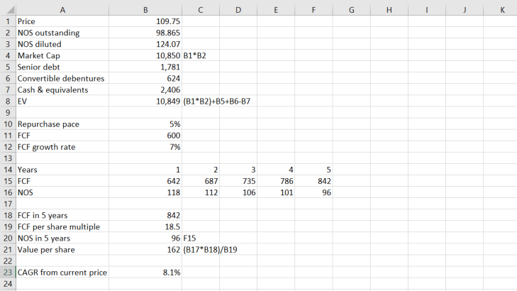 Para Verisign, hay tres cosas que juegan un rol muy importante. Uno es el paso de recompra de acciones. Verisign es un “caníbal” ya que ha comprado sus propias acciones de forma constante en el tiempo. Históricamente esta tasa de recompra ha estado por encima del 5% de forma anual, pero para ser conservadores asumiremos 5%. Segundo, el free cash flow ha crecido en promedio 7% durante los últimos 10 años, así que debido a la estabilidad del negocio y la poca ciclicidad que tiene, podemos usar el 7% como un buen referente de crecimiento hacia adelante. Por último, el múltiplo al que cotiza Verisign (P/FCF) es generalmente 20. Yo estoy utilizando 18x por ser conservador. Siempre he creído que es mejor sorprenderse del lado positivo a pecar de optimista y decepcionarse. La valuación se ve así: