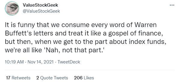 En estos días me llamó la atención un comentario en Twitter sobre como discriminamos (por favor nota que estoy incluido😊 ) los consejos generales de una de las leyendas de las inversiones: Warren Buffett. El comentario es simple: Buffett lleva diciendo por años (está mencionado desde el reporte anual de 1996) que una de las mejores maneras de invertir es comprar fondos indizados (ahora ETFs). ¿Por qué es que no lo hacemos? ¿Cuáles son las probabilidades a nuestro favor? Veamos el tema un poco más a detalle.