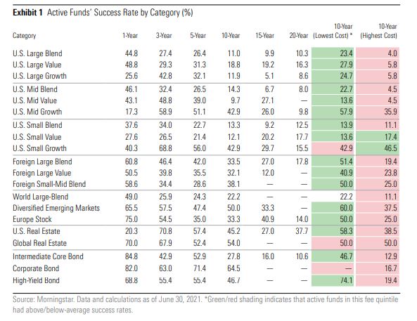 Los datos respaldan estas nociones. Investigando un poco sobre el tema, me encontré un documento de Morningstar en el que se evalúa el performance de varios tipos de fondos y se analiza qué porcentaje de ellos le gana a su índice de referencia a través de los años. En periodos de 10 años, solo cerca del 10% de los fondos le gana al S&P500 (categoría US large-cap). En periodos más largos la tasa cae aún más. En algunos segmentos como growth existe consistencia de resultados, por ejemplo en US mid-cap growth o US small-cap growth. También en algunos segmentos menos seguidos, como acciones foráneas o bonos, el porcentaje de fondos que tienen mejor performance que su benchmark es mayor. Aquí, me parece podríamos argumentar que podrían existir ciertas ineficiencias de mercado (acceso a información, menor cobertura de analistas y/o participantes de mercado) que causan esto. El punto es que los datos sugieren que los comentarios de Buffett hacen sentido: el base rate de probabilidad para ganarle al S&P de manera consistente entre profesionales es cercana al 10%.