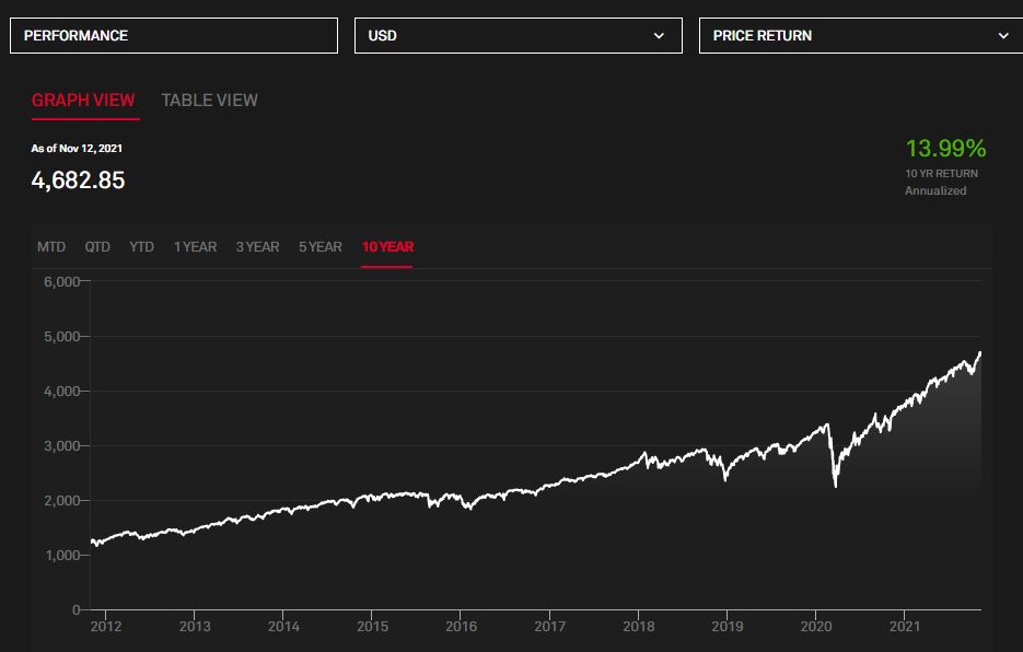 Algunos de los beneficios de los ETFs son su bajísimo costo de administración. Tan solo el Vanguard S&P500 (con ticker VOO) tiene una tasa de administración de 0.03%, lo que los convierten en instrumentos muy accesibles para cualquier inversionista. En El Inversionista Inteligente, Ben Graham destaca que existen dos tipos de inversionistas, el defensivo y el emprendedor. La diferencia entre ambos no es la habilidad, si no el tiempo que se le puede dedicar a conocer a fondo empresas como opciones de inversión. El mismo Buffett ha mencionado que dado que incluso los profesionales tienen dificultades para vencer a su índice de referencia, la combinación de bajo costo y buen rendimiento a través del tiempo, hacen a los fondos indizados una buena opción para la mayoría del público inversionista. Aquí abajo el rendimiento anualizado del S&P500 en los últimos 10 años. El rendimiento de ~14% en los últimos años ha convertido US$100,000 dólares en US$370,397, lo cual no es nada despreciable (y sin voltear a ver ni un reporte financiero). Para aquellos con la curiosidad, aquí la lista de miembros del S&P500 más actualizada.