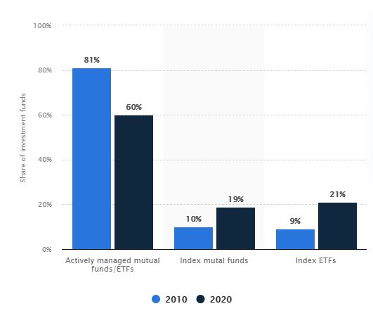 El mercado ya se dio cuenta y ha creado una oferta de productos para satisfacer la demanda. Con datos de Statista, al cierre de 2020, el total de activos bajo administración (assets under management o AuM en inglés) en fondos mutuos y ETFs era de US$24.9 trillones. De estos, los activos ligados a índices (conocidos también como instrumentos pasivos) han ganado cada vez más relevancia. Los fondos administrados de forma activa (es decir, aquellos que intentan ganarle al índice) han caído de 81% del mercado a solo 60% en un periodo de 10 años. Los fondos mutuos que replican al índice han crecido de 10 a 19%, mientras que los ETFs con referencia a algún índice han pasado de 9% del mercado a 21%.