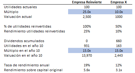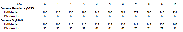 La empresa Reinvierte genera un ROIC de 25% y no paga dividendos, simplemente reinvierte todas las utilidades para seguir generando ese 25%. Por el otro lado, la empresa X paga dividendos pero sólo genera el 10% sobre el capital. El mercado ha reaccionado al respecto, pagando un múltiplo de 25x por el gran crecimiento de la empresa Reinvierte, mientras que únicamente paga 10x por las utilidades de la empresa X.