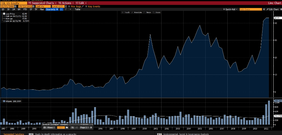 4. Preguntarse, ¿por qué al negocio le fue mal? (O cómo diría Munger: ¿Por qué yo encontré esta oportunidad, Dios?) Para dar un poco de contexto, Timberland tuvo una serie de disputas legales que la hicieron perder el favor de los inversionistas. Aunado a eso, pasaron por la crisis asiática en 1997, registrando caída importante en ventas en la zona durante ese periodo. La empresa no cotiza más, ya que fue adquirida cerca de 2011. Aquí la gráfica del comportamiento de su precio hasta su desliste. Li Lu mencionó que durante este tiempo no había analistas cubriendo la empresa.