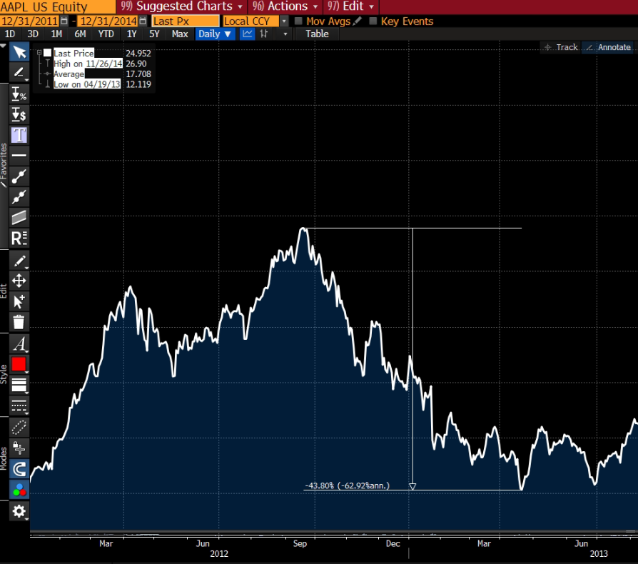 En el caso de Apple, quedó demostrado que lo importante es el futuro y al ser incierto, el sentimiento de corto plazo es dominado por la narrativa. Cuando la narrativa es tan pesimista como a finales de 2012 para Apple, habrá siempre un tiempo de incertidumbre y (aún) mayor pesimismo. Esto es normal y parte de las fluctuaciones normales de cualquier negocio.