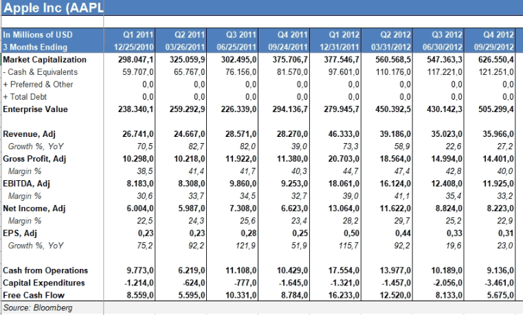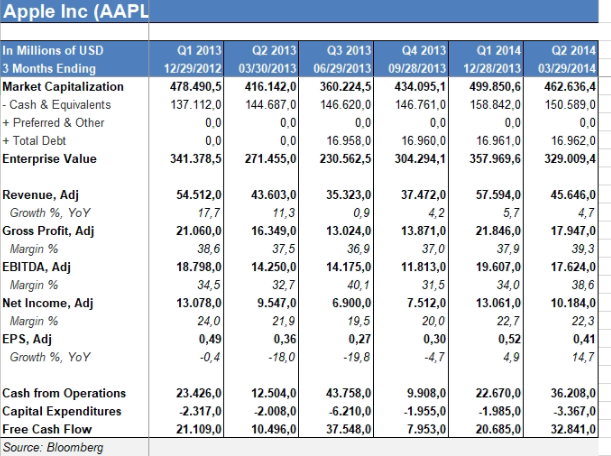 A pesar de que los medios busquen prolongar el sentimiento con más artículos y videos al respecto, los ojos del inversionsita inteligente ya voltearon a otro lugar: los fundamentales de la empresa. Por esas épocas, los datos fundamentales de Apple se veían así: