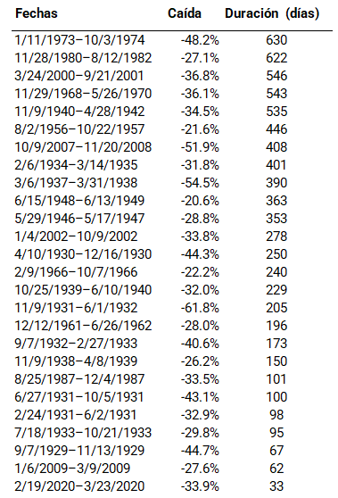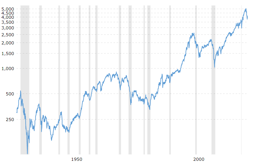 No digo que no viviremos tiempos difíciles. Tampoco que ya pasó lo peor. Esta tabla nos muestra los bear markets más relevantes desde 1900. Con una duración promedio de 290 días, podríamos estar a mitad del camino, o en términos de magnitud, podríamos estar lejos todavía. ¿Qué es lo relevante de esta gráfica? No es asustarnos (Taleb diría que ver al pasado para imaginar el futuro es baladí), sino apostar a que en el largo plazo, las mejores empresas salen adelante, al igual que los organismos con la evolución. Aquí también la gráfica del índice S&P500 a lo largo de la historia.