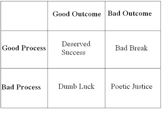 Depender de la suerte no es una estrategia. Un mal proceso tenderá a llevarnos a perder dinero eventualmente, como uno bueno tenderá a ayudarnos a ganar dinero en el largo plazo. En resumen queremos estar en el primer cuadrante, sabiendo que eventualmente podemos pisar el segundo.