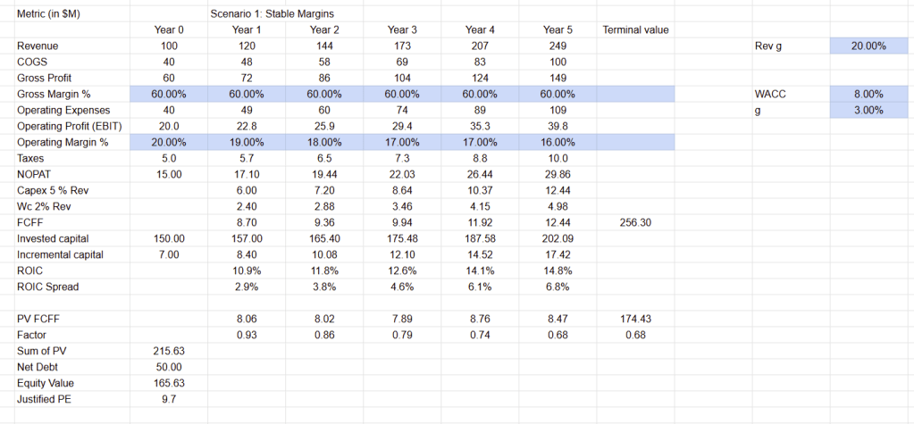 Escenario 1: Crecimiento Rentable (La Empresa A) Imagina una empresa que crece a un ritmo moderado (por ejemplo, 10% anual), pero mantiene sus márgenes brutos y operativos estables y saludables. Sus inversiones generan un ROIC consistentemente por encima de su WACC.